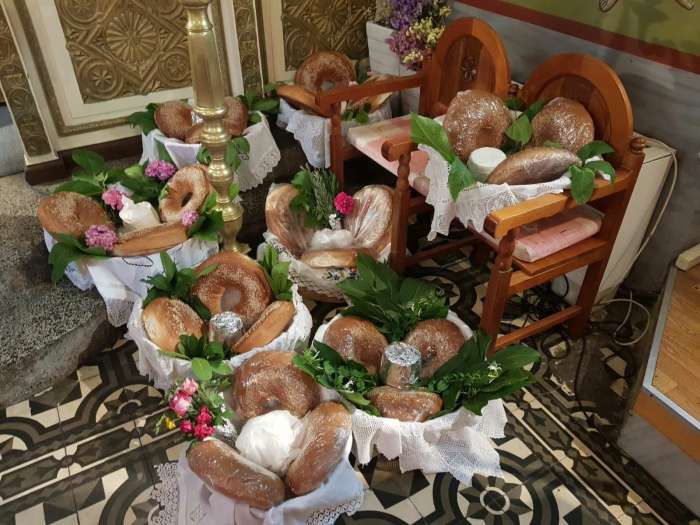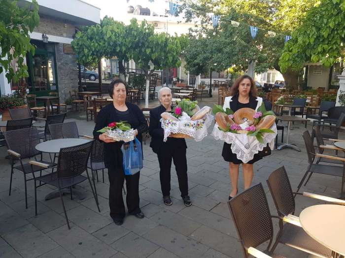 Οι γυναίκες τιμούν τους νεκρούς στολίζοντας ένα πανέρι με τρία γλυκά κουλούρια κι ένα ανθότυρο η τυρί στη μέση, με καρυδόφυλλα… και τριαντάφυλλα και τα πηγαίνουν στην εκκλησία προσφορά για αυτούς που έχουν φύγει.