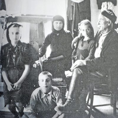 «…εγώ είμαι που στέκω και ο αδερφός μου ο Γιώργης είναι που τον έχει στην ποδιά του ο πατέρας μου. Το σπίτι μας το’χανε φυλάκιο οι Γερμανοί. Ήτανε καλό σπίτι, μεγάλο, κεραμιδωτό με τέσσερα νερά. Εμείς εφύγαμε και πήγαμε επαδέ κάτω σε ένα χωριό στο Βενί. Αλλά δεν ήξερε η συχωρεμένη η μάνα μου, που κρατούσαμε εμείς τα κοπέλια, ανέ ζούμε ή όχι. Είχανε πάει εκειά στο μύλο σαράντα άτομα, όλη μας η φάρα. Ήρχουντανε στο σπίτι η μάνα μου γιατί ήτονε ακόμη αχάλαστο, το’χανε φυλάκιο οι Γερμανοί.