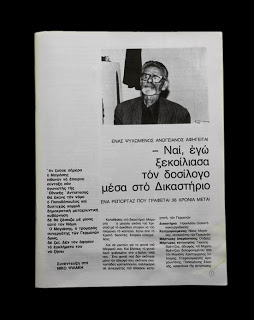 Έγραψα το ρεπορτάζ την επόμενη μέρα. Κι αυτό με δυσκολία. Σκεφτόμουν ότι δεν έπρεπε να διαψεύσω τις προσδοκίες αυτού του ανθρώπου, να μην προδώσω την απρόσμενη εμπιστοσύνη του. Σκεφτόμουν, ακόμη, ότι οι μνήμες ήταν ακόμη νωπές και πως 35 χρόνια δεν φτάνουν για να γίνει ιστορία κάποιο περιστατικό, όσο σημαντικό και να ’ναι. Απλώς οι προφορικές διηγήσεις το μετουσιώνουν σε θρύλο. Έτσι εξηγούσα όλες εκείνες τις εκδοχές που ακούγονταν σχεδόν παντού στο νησί για τον Κρητικό που μπήκε στο δικαστήριο και έκοψε το κεφάλι του προδότη.