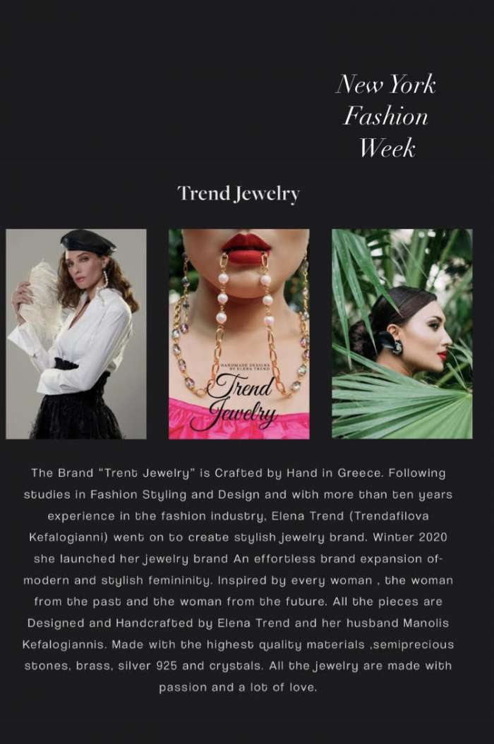 Η ίδια η δημιουργός λέει στο cretalive: «Κάποια στιγμή συνεργάστηκα με το showroom «Flying Solo» στη Νέα Υόρκη και στη συνέχεια δήλωσα συμμετοχή στην Εβδομάδα Μόδας. Μεταξύ χιλιάδων αιτήσεων οι διοργανωτές διάλεξαν 83 σχεδιαστές από 18 χώρες σε όλο τον κόσμο και ανάμεσα σε αυτούς ήμουν κι εγώ. Κάπως έτσι το όνειρό μου έγινε πραγματικότητα στις 13/2/2021 στην Εβδομάδα Μόδας Νέας Υόρκης όπου παρουσίασα τη συλλογή των κοσμημάτων μου και λάνσαρα επίσημα το Brand «Trend Jewelry». Δυστυχώς εγώ δεν μπόρεσα να παρευρεθώ αλλά εκπροσωπήθηκα από τους συνεργάτες μου».