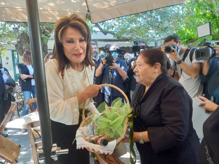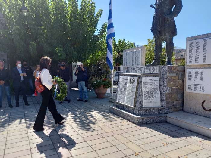 Μετά το δημαρχείο η Γιάννα Αγγελοπούλου Δασκαλάκη, κατέθεσε στεφάνι στο Ηρώο στο Αρμί, τονίζοντας την ιστορία των Ανωγείων με τα τρία Ολοκαυτώματα και πόσο ήθελε να δει την πλάκα με τα πέντε “επειδή” των Ναζί για το Ολοκαύτωμα του 1944.