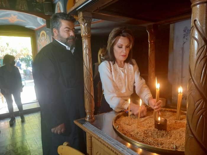 Στη συνέχεια όλοι βρέθηκαν στο Μειντάνι και αρχικά στην εκκλησία του Αι Γιώργη όπου ο παπά Ανδρέας Κεφαλογιάννης της διάβασε μια ευχή, η κα Αγγελοπούλου- Δασκαλάκη άναψε κεριά για αυτήν και όλη την οικογένεια της και άκουσε με ενδιαφέρον την ιστορία με τις τοιχογραφίες των “Αγίων” της Επανάστασης του 1821, όπως και για τις εξωτερικές τοιχογραφίες του Ναού.