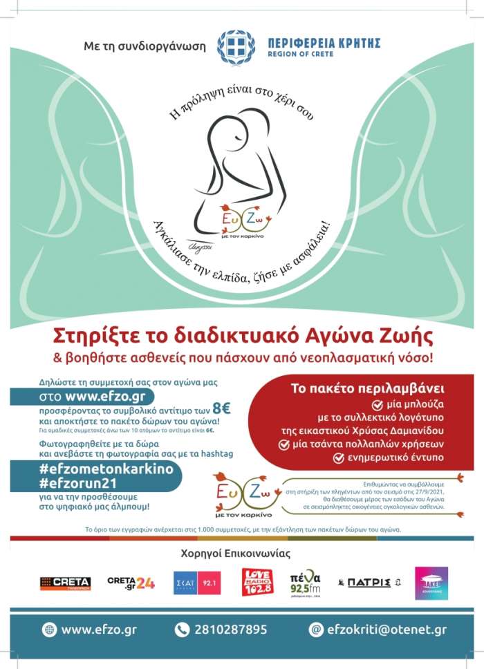 Ο Σύλλογος στήριξης ασθενών με νεοπλασματική νόσο «Ευ Ζω με τον Καρκίνο» θα πραγματοποιήσει για δεύτερη χρονιά φέτος έναν διαδικτυακό Αγώνα για την πρόληψη του καρκίνου με συνδιοργανωτή την Περιφέρεια Κρήτης.