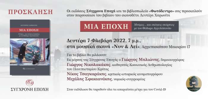 Οι εκδόσεις «Σύγχρονη Εποχή» και το βιβλιοπωλείο «Φωτόδεντρο» παρουσιάζουν το βιβλίο του σκηνοθέτη Λευτέρη Χαρωνίτη με τίτλο «Μια Εποχή. Μνήμες και σκέψεις σκόρπιες με τον Θόδωρο Αγγελόπουλο» τη Δευτέρα 7 Φλεβάρη στις 7 το απόγευμα, στη Μουσική Σκηνή «Νυν & Αεί», Αρχιεπισκόπου Μακαρίου 17, στο Ηράκλειο Κρήτης.