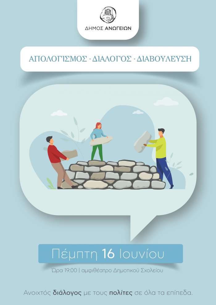 Όλους τους δημότες των Ανωγείων, καλεί ο δήμαρχος Σωκράτης Κεφαλογιάννης την Πέμπτη 16 Ιουνίου, στις 7 μ.μ στο Αμφιθέατρο του δημοτικού σχολείου, για μια συζήτηση για τα θέματα που τους απασχολούν, τις προτεραιότητες και τις ανάγκες τους, αλλά και ένα απολογισμό της μέχρι σήμερα δημοτικής θητείας. “Απολογισμός, διάλογος, διαβούλευση.” αναφέρει ο δήμαρχος Ανωγείων, που απευθύνεται στον κόσμο, ζητώντας την κριτική του, αλλά και ιδέες που θα μπορούσαν να φανούν χρήσιμες εφόσον θα μπορούσαν να υλοποιηθούν.