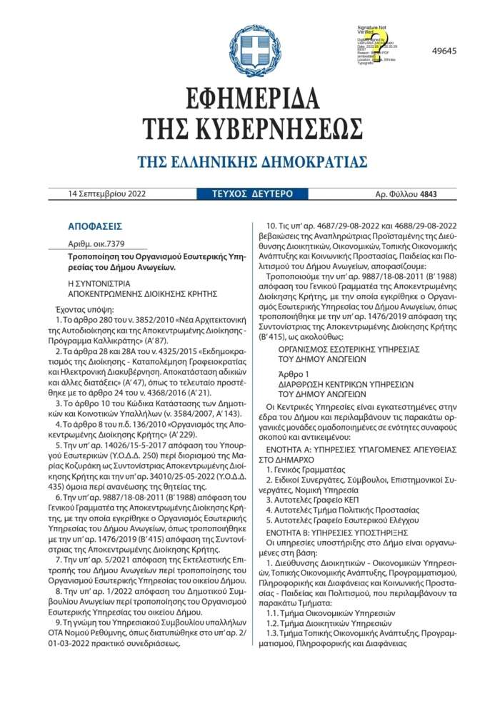 «μια επίπονη διαδικασία για τα στελέχη του Δήμου μας, ολοκληρώθηκε με αίσιο τέλος την δημοσίευση στο ΦΕΚ της σχετικής τροποποίησης του Οργανισμού Εσωτερικών Υπηρεσιών του Δήμου Ανωγείων.