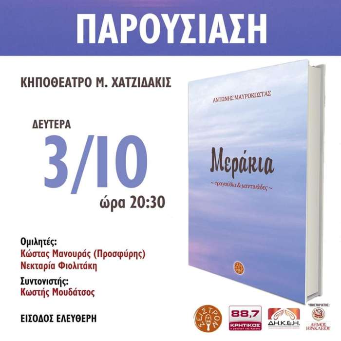 Σας προσκαλούμε την Δευτέρα 3 Οκτωβρίου και ώρα 20:30 στο κηποθέατρο Μάνος Χατζιδάκις για να σας παρουσιάσουμε το βιβλίο του Αντώνη Μαυρόκωστα με τίτλο «Μεράκια».