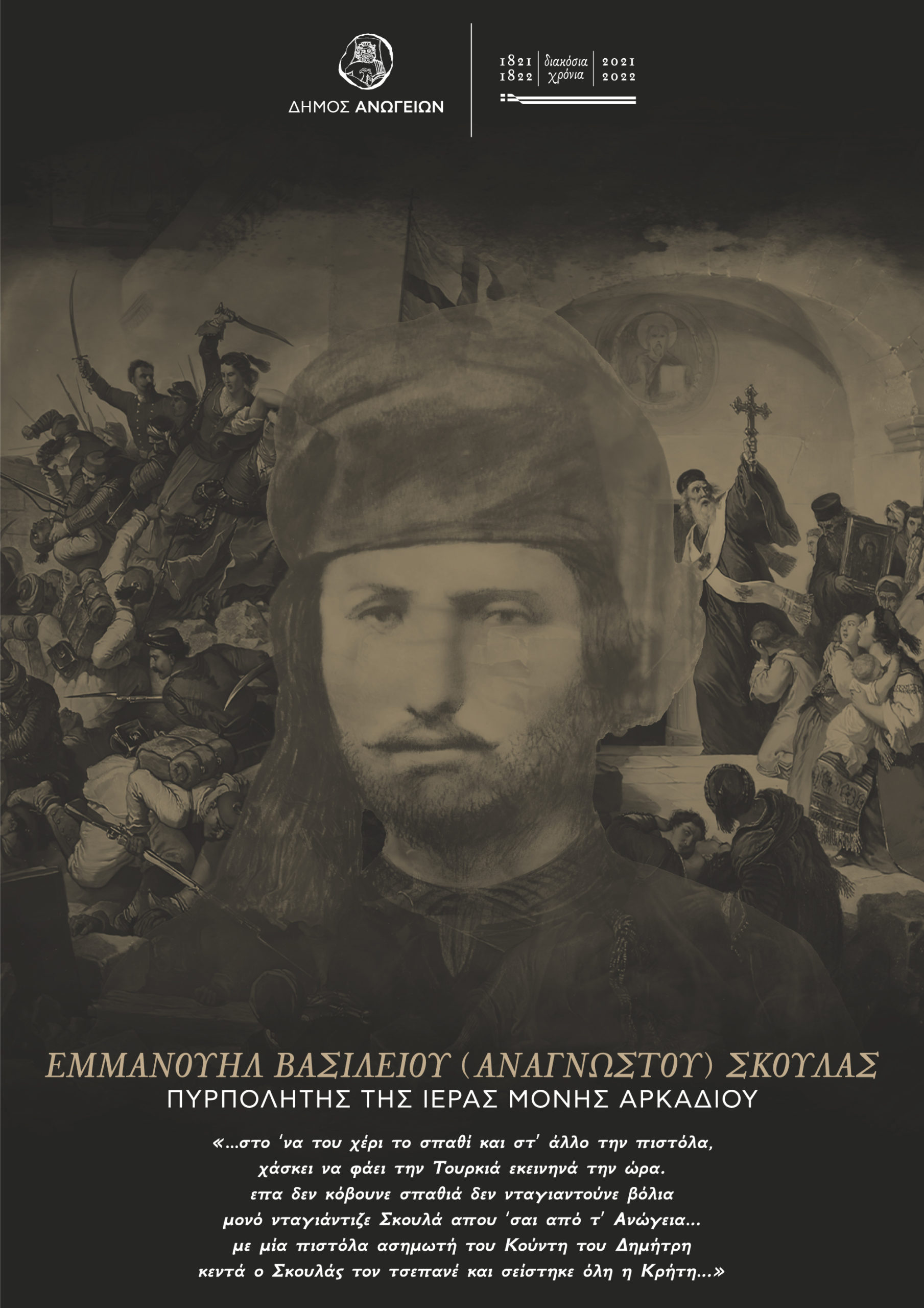 Ο Δήμος Ανωγείων τιμώντας την μνήμη των Ηρώων της Αρκαδικής Εθελοθυσίας, σας προσκαλεί στην εκδήλωση που θα πραγματοποιηθεί στο χώρο του Ανδριάντα του Ήρωα Εμμανουήλ Βασιλείου Αναγνώστου Σκουλά, Πυρπολητή της Ιεράς Μονής Αρκαδίου , στις 7 Νοεμβρίου 2022, ημέρα Δευτέρα και ώρα 12 μ.μ.