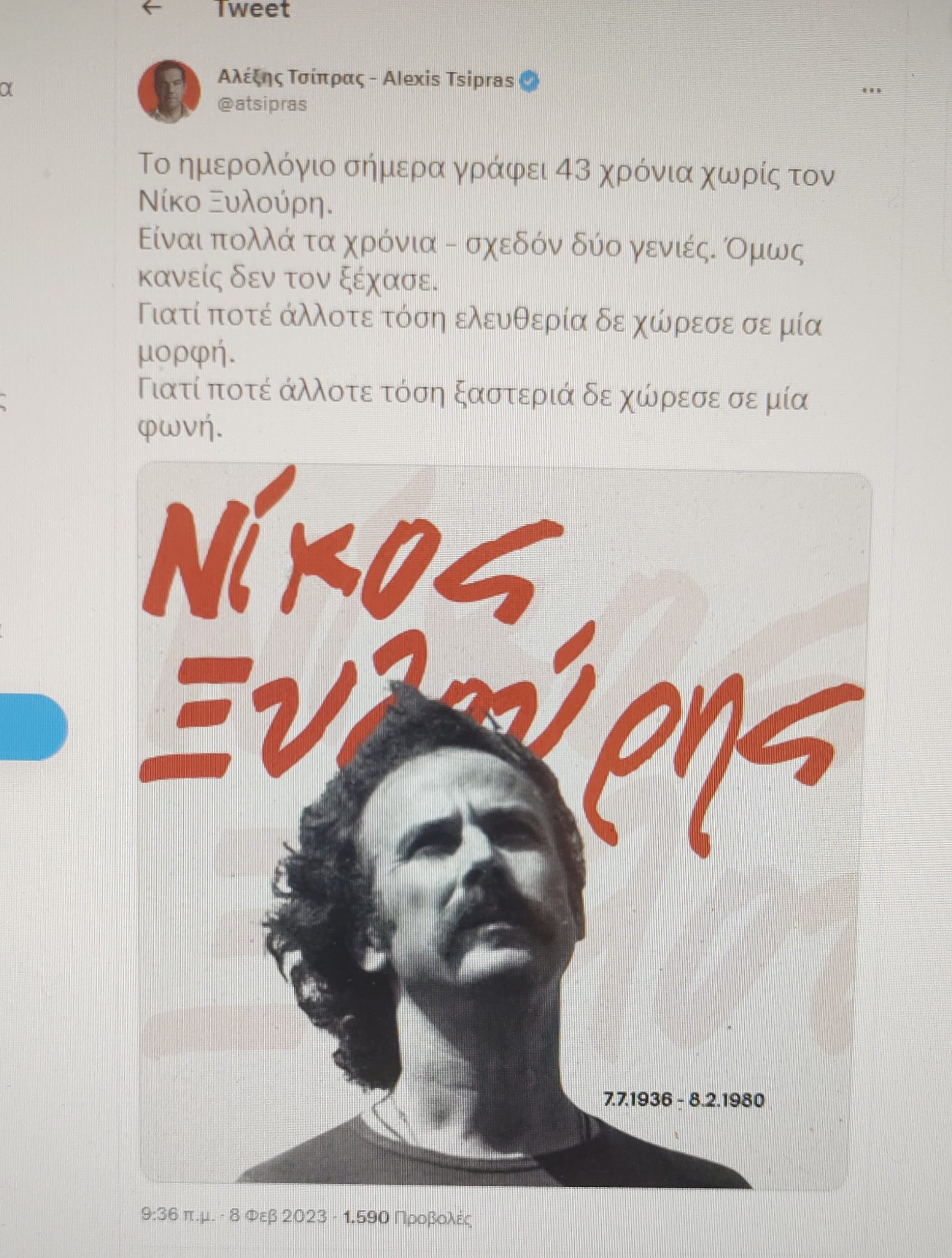 “Το ημερολόγιο σήμερα γράφει 43 χρόνια χωρίς τον Νίκο Ξυλούρη.