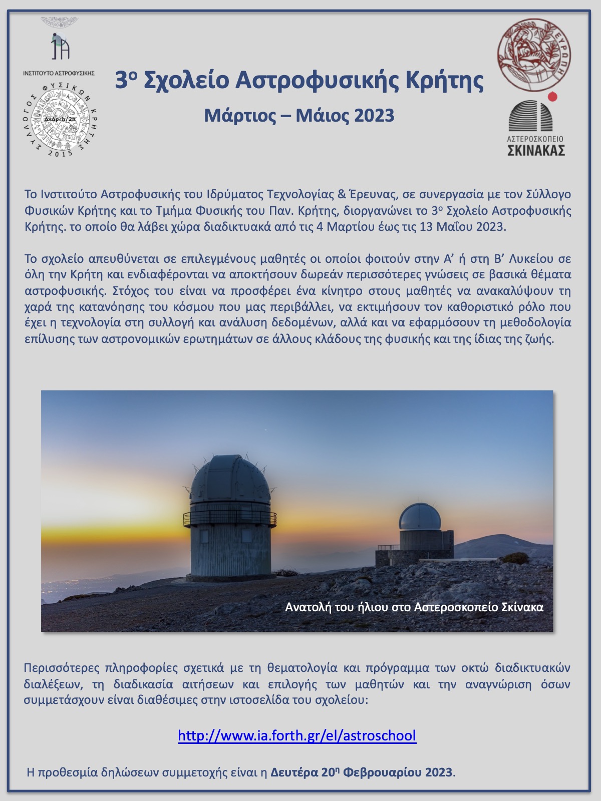 Το Tμήμα Φυσικής του Πανεπιστημίου Κρήτης σε συνεργασία με το Ινστιτούτο Αστροφυσικής του Ιδρύματος Τεχνολογίας και Έρευνας και τον Σύλλογο Φυσικών Κρήτης, διοργανώνουν το 3ο Διαδικτυακό Σχολείο Αστροφυσικής Κρήτης το οποίο θα λάβει χώρα από το Μάρτιο έως το Μάιο 2023.