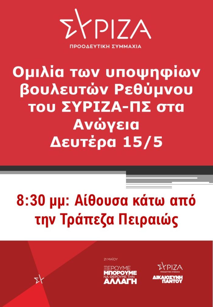 Οι υποψήφιοι Βουλευτές Ρεθύμνου του ΣΥ.ΡΙ.ΖΑ σας προσκαλούν σε ανοιχτή εκδήλωση όπου θα μιλήσουν στον κόσμο των Ανωγείων, την Δευτέρα 15 Μάϊου στις 8.30 μ.μ στην αίθουσα “Μανώλης Κεφαλογιάννης” της Τράπεζας Πειραιώς.