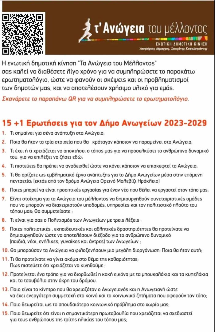 Με 15 ερωτήσεις για τα Ανώγεια της περιόδου 2023-2029 σε αναζήτηση ιδεών και προτάσεων από τους Ανωγειανούς όπου γης και τους φίλους του τόπου μας, η δημοτική κίνηση του νυν δημάρχου Σωκράτη Κεφαλογιάννη απευθύνεται στον κόσμο με ένα ερωτηματολόγιο που μπορεί να αποτελέσει χρήσιμο υλικό για τη δημοτική αρχή που θα προκύψει από τις εκλογές της 8ης Οκτωβρίου.