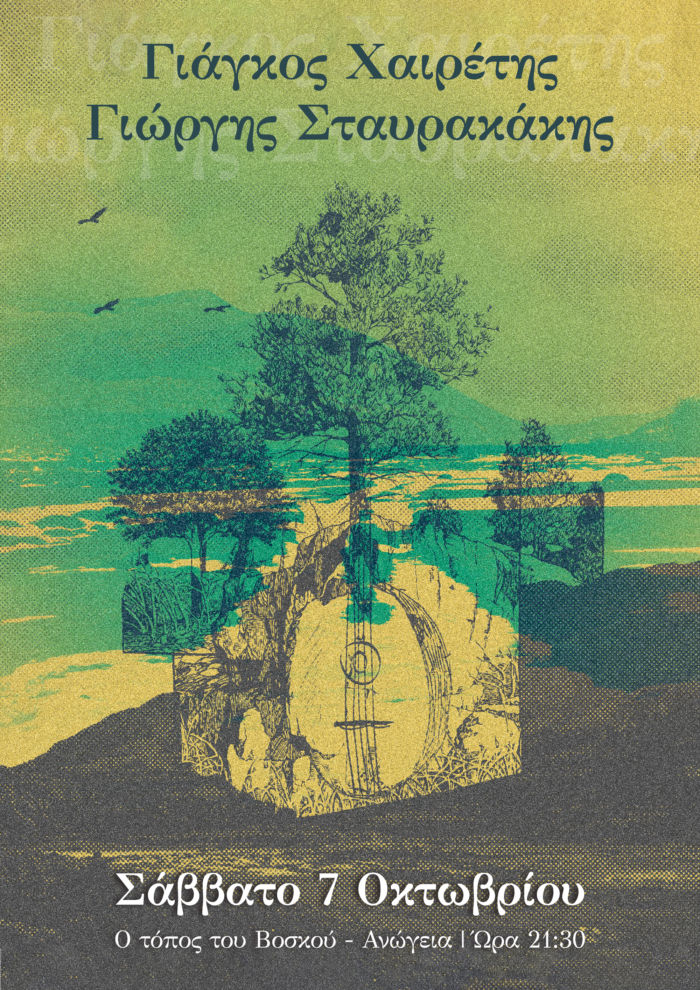 “Το Σάββατο 7 Οκτωβρίου και ώρα 21:30 το βράδυ στον Τόπο του Βοσκού θα βρίσκονται δύο καταξιωμένοι καλλιτέχνες. Ο Γιάγκος Χαιρέτης και ο Γιώργης Σταυρακάκης.