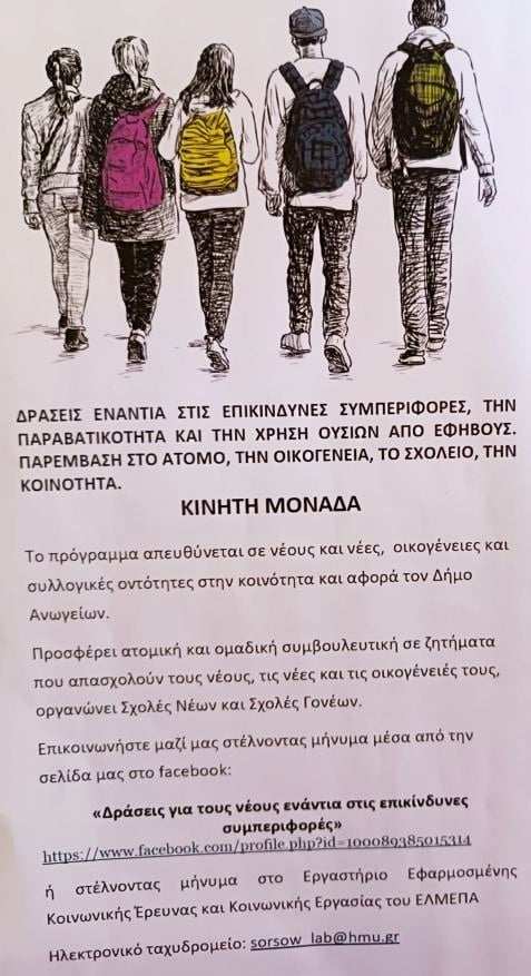 Η Κινητή Μονάδα του προγράμματος “Δράσεις ενάντια στις επικίνδυνες συμπεριφορές, την παραβατικότητα, τη χρήση ουσιών από εφήβους. Παρέμβαση στο άτομο, την οικογένεια, το σχολείο, την κοινότητα” του Τμήματος Κοινωνικής Εργασίας ΕΛΜΕΠΑ στα πλαίσια των δράσεων που υλοποιεί στο Δήμο Ανωγείων και σε συνεργασία με το Σύλλογο γονέων και κηδεμόνων του Λυκείου Ανωγείων θα πραγματοποιήσει 4 συναντήσεις με γονείς .