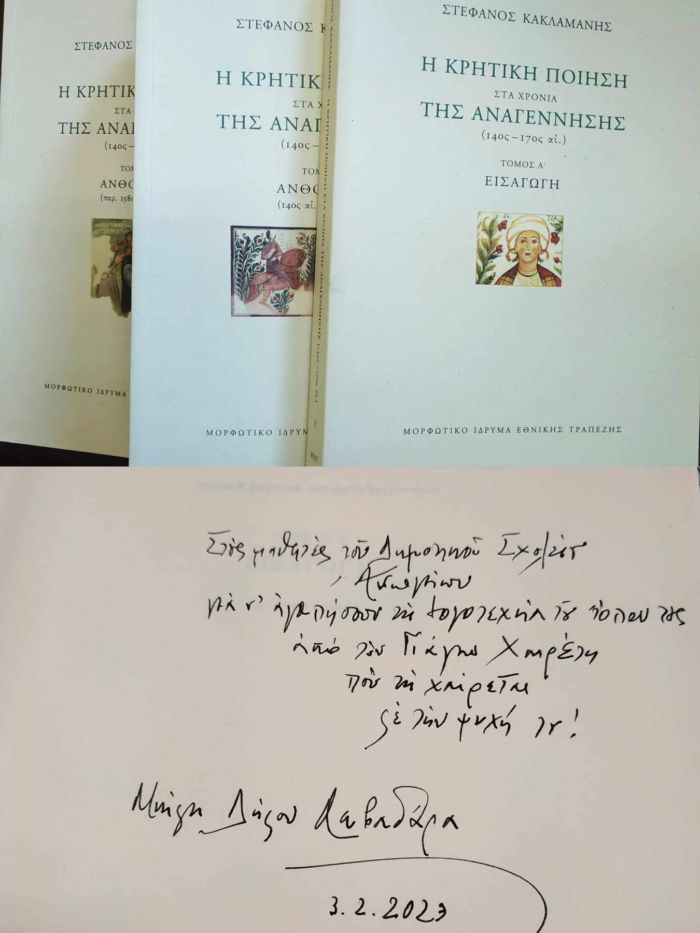 Ένα στολίδι της κρητικής ποίησης στα χρόνια της αναγέννησης, ήρθε να κοσμήσει τη βιβλιοθήκη μας και να μεταλαμπαδεύσει την αγάπη για την κρητική λογοτεχνία στους μαθητές του Σχολείου μας, σύμφωνα και με την επιθυμία του δωρητή της Γιάγκου Χαιρέτη.. Πρόκειται για το τρίτομο έργο του Στέφανο Κακλαμάνη “Η Κρητική λογοτεχνία στα χρόνια της αναγέννησης” που χάρισε στη “Βιβλιοθήκη – Γεώργιος Σμπώκος” του Σχολείου μας, ο αγαπητός μας Γιάγκος Χαιρέτης, στη μνήμη Δήμου Λειβαδάρα. Το Σχολείο εκφράζει θερμές ευχαριστίες στο δωρητή του έργου”.