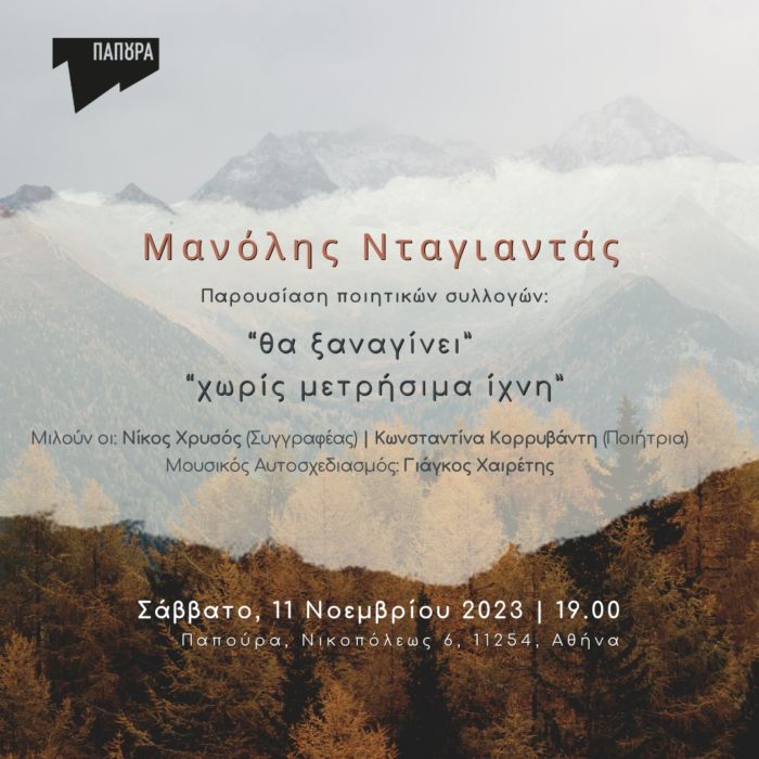 Με αφορμή τις ποιητικές συλλογές του “Θα ξαναγίνει” και “Χωρίς μετρήσιμα ίχνη”, θα ταξιδέψει από την Κρήτη και στις 11 Νοεμβρίου, στις 19.00 το απόγευμα, θα βρεθεί στην Παπούρα για να μας μιλήσει για το έργο του και τις διάφορες πτυχές της ποιητικής δημιουργίας, παρέα με τον συγγραφέα Νίκο Χρυσό(Νίκος Χρυσός) και την ποιήτρια Κωνσταντίνα Κορρυβάντη.