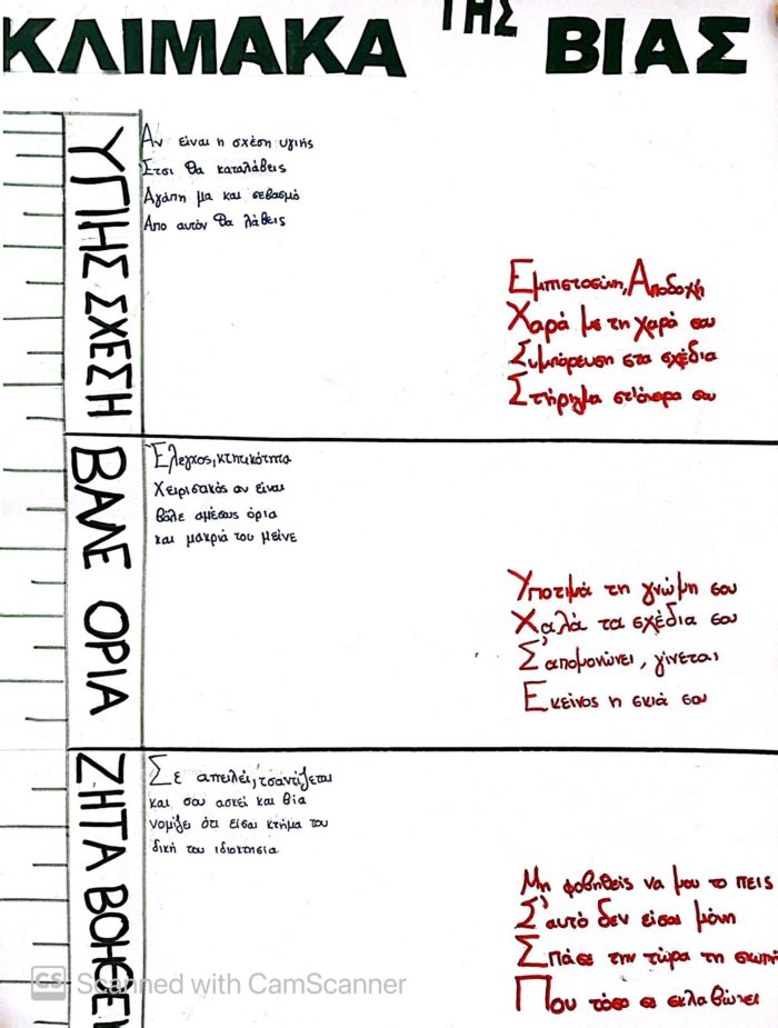 Αφού πραγματοποιήθηκαν αρχικές παρεμβάσεις στη σχολική κοινότητα, για την ενημέρωση και την ευαισθητοποίηση των μαθητών, συγκροτήθηκε μια μικρή ομάδα μαθητών της Α’ και Β’ Λυκείου, για την δημιουργία ενός σύντομου video και μιας αφίσας, με στόχο να προωθηθούν μηνύματα προς τους συμμαθητές τους, σχετικά με τη βία κατά των κοριτσιών και των γυναικών γενικότερα. Συγκεκριμένα οι μαθητές που συμμετείχαν ήταν οι: