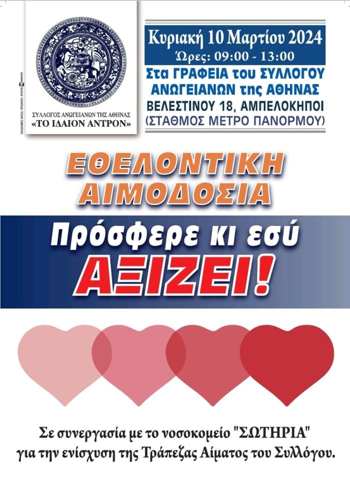 Παράλληλα με τις εκλογές θα διεξαχθεί εθελοντική αιμοδοσία σε συνεργασία με το νοσοκομείο “Σωτηρία” που θα ξεκινήσει στις 9 το πρωί και θα ολοκληρωθεί στη 1 μ.μ Όπως αναφέρει το Δ.Σ του Συλλόγου των Ανωγειανών της Αθήνας: