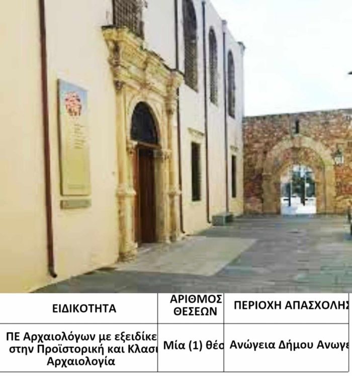 Προκήρυξη πρόσληψης επιστημονικού προσωπικού με σύμβαση εργασίας ιδιωτικού δικαίου ορισμένου χρόνου για το υποέργο 2 «Αρχαιολογική Αυτεπιστασία» στο πλαίσιο του έργου «ΑΝΑΒΑΘΜΙΣΗ ΕΓΚΑΤΑΣΤΑΣΗΣ ΕΠΕΞΕΡΓΑΣΙΑΣ ΛΥΜΑΤΩΝ (ΕΕΛ) ΔΗΜΟΥ ΑΝΩΓΕΙΩΝ (ΑΝΑΚΑΤΑΣΚΕΥΗ-ΒΕΛΤΙΩΣΗ-ΤΡΙΤΟΒΑΘΜΙΑ ΕΠΕΞΕΡΓΑΣΙΑ ΚΑΙ ΣΥΣΤΗΜΑ ΔΙΑΘΕΣΗΣ ΕΚΡΟΩΝ)», απολογιστικά και με αυτεπιστασία από την Εφορεία Αρχαιοτήτων Ρεθύμνου.
