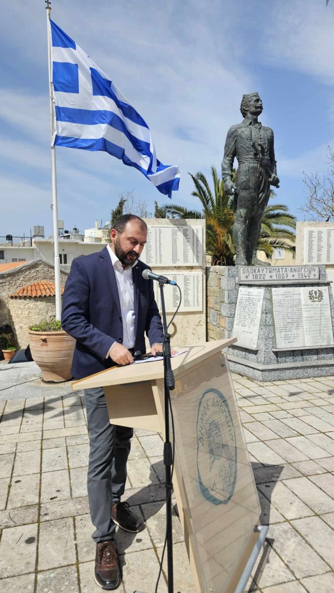 Σεβασμιότατοι πατέρες της εκκλησίας, Αξιότιμε κε Δήμαρχε και μέλη του Δημοτικού συμβουλίου Ανωγείων, Αξιότιμε κε Διοικητά, κυρίες και κύριοι ,αγαπητά μας παιδιά. Σας ευχαριστώ εκ προοιμίου για την τιμή της εκφώνησης αυτού του λόγου μια τόσο σημαντική ημέρα του έθνους μας. Στην σύντομη αυτή ομιλία δεν θα σταθώ μόνο στο ιστορικό παρελθόν, ως συνηθίζεται. Θα το εκμεταλλευτώ όμως για να αντιληφθούμε το αμφίβολο παρόν και θα σας παροτρύνω να στοχεύσουμε σε ένα απελευθερωμένο μέλλον.