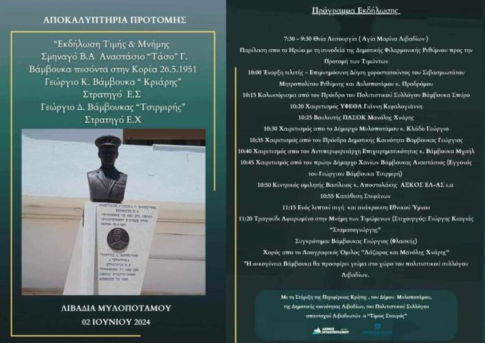 Η εκδήλωση θα γίνει την Κυριακή 2 Ιουνίου 2024 στα Λιβάδια του Δήμου Μυλοποτάμου, στην μνήμη των ηρώων Σμηναγού Β.Α. Αναστάσιου «Τάσου» Γ. Βάμβουκα (πεσόντα στην Κορέα 26.5.1951), Στρατηγού Ε.Σ. Γεωργίου Κ. Βάμβουκα «Κριάρης» και του Στρατηγού Ε.Χ. Γεωργίου Δ. Βάμβουκα «Τσιρμιρής».