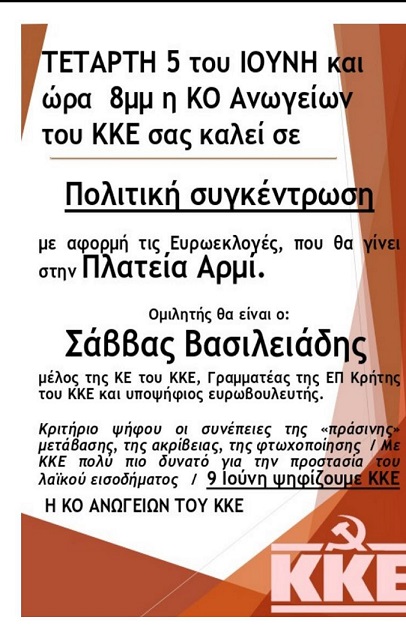 Τετάρτη 5 Ιουνίου, πλατεία Αρμί: Πολιτική συγκέντρωση του ΚΚΕ με ομιλητή τον Σάββα Βασιλειάδη