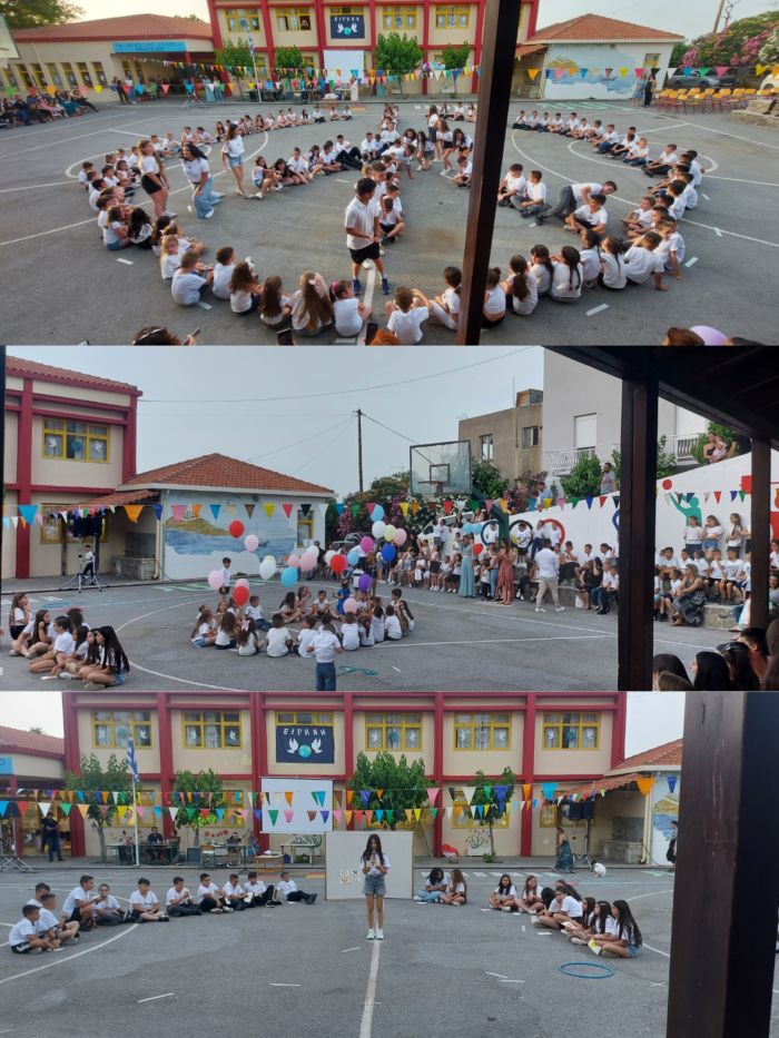 Μέσα σε κλίμα χαράς και συγκίνησης, παρουσία του δημάρχου Ανωγείων κ. Σωκράτη Κεφαλογιάννη, της αντιδημάρχου κ. Μαρίας Φιολιτάκη, Δημοτικών Συμβούλων και πλήθους κόσμου, πραγματοποιήθηκε η γιορτή λήξης των μαθημάτων, στην αυλή του Σχολείου μας, αφιερωμένη στους απόφοιτους. Η γιορτή είχε θέμα την «ειρήνη» και οι μαθητές με την είσοδό τους , έδωσαν το στίγμα, σχηματίζοντας το σήμα της ειρήνης και χορεύοντας το τραγούδι «we are the world”. Ακολούθησε η ομιλία της Διευθύντριας του Σχολείου Κ. Χατζάκη Τριανταφυλλιάς, η οποία αναφέρθηκε στη σημασία της εκπαίδευσης για την ειρήνη και τα σημαντικά βήματα που έκανε το Σχολείο για την εκπαίδευση των μαθητών του.