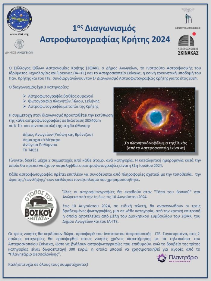 Ο Σύλλογος Φίλων Αστρονομίας Κρήτης (ΣΦΑΚ), ο Δήμος Ανωγείων και το Ινστιτούτο Αστροφυσικής του Ιδρύματος Τεχνολογίας και Έρευνας (ΙΑ-ΙΤΕ) συνδιοργανώνουν τον 1ο διαγωνισμό Αστροφωτογραφίας Κρήτης για το έτος 2024.