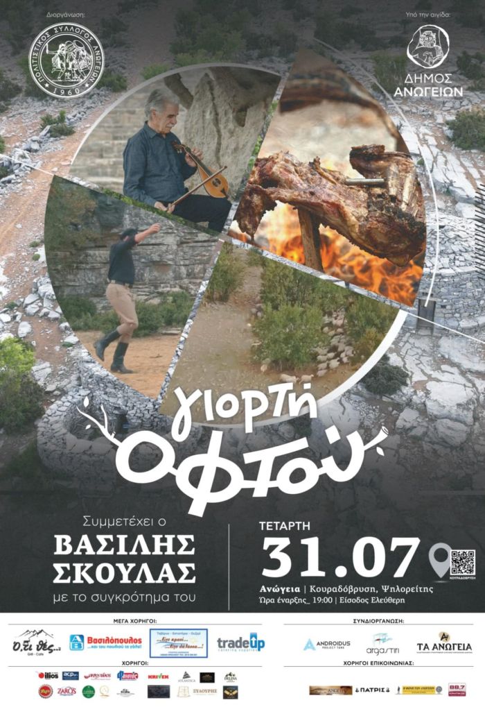 Η «Γιορτή Οφτού» είναι αφιερωμένη στο παραδοσιακό κρητικό έδεσμα, το οφτό κρέας, το οποίο είναι ένας από τους πιο αγαπημένους μεζέδες της τοπικής μας κουζίνας. Οι επισκέπτες θα έχουν την ευκαιρία να απολαύσουν το οφτό, μαγειρεμένο με τον παραδοσιακό Ανωγειανό τρόπο, συνοδευόμενο από τοπικά προϊόντα. Τα αγνά υλικά της κρητικής γης, μεταμορφώνονται στα χέρια των ντόπιων σε γευστικά αριστουργήματα που μιλούν στην καρδιά.