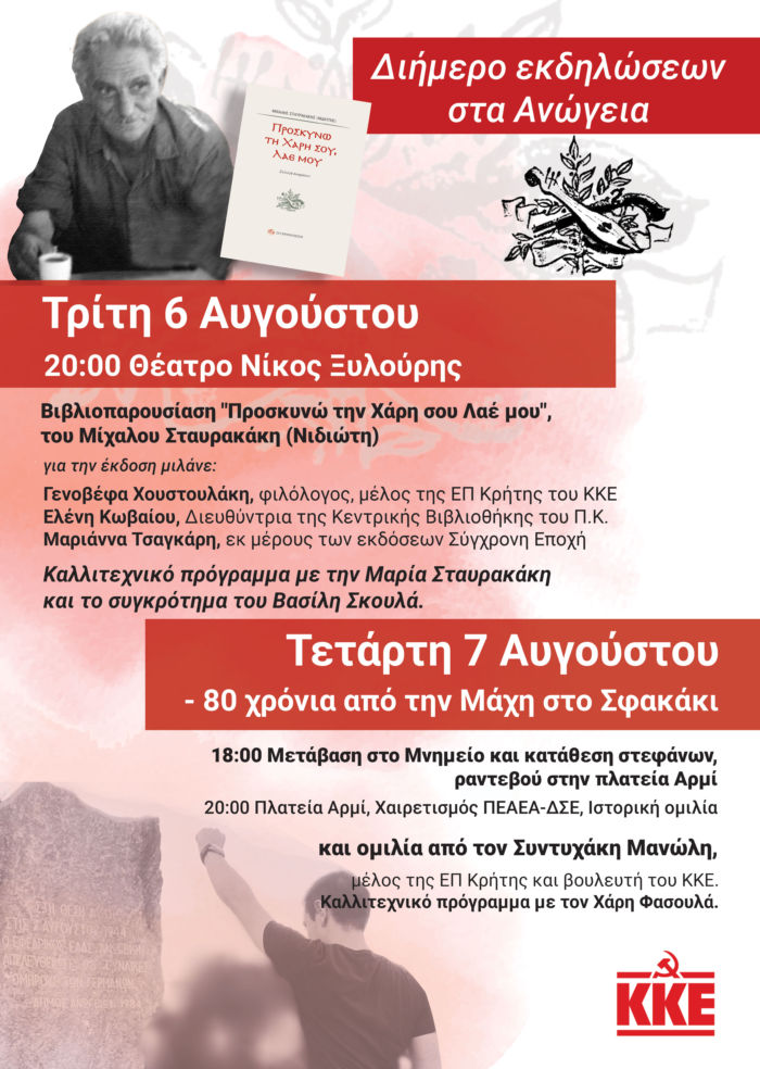 -Τρίτη 6/8 στις 20:00 στο Θέατρο «Νίκος Ξυλούρης». Βιβλιοπαρουσίαση «Προσκυνώ την χάρη σου λαέ μου», συλλογή ποιημάτων του Μιχάλη Σταυρακάκη (Νιδιώτη) από τις εκδόσεις της Σύγχρονης Εποχής.