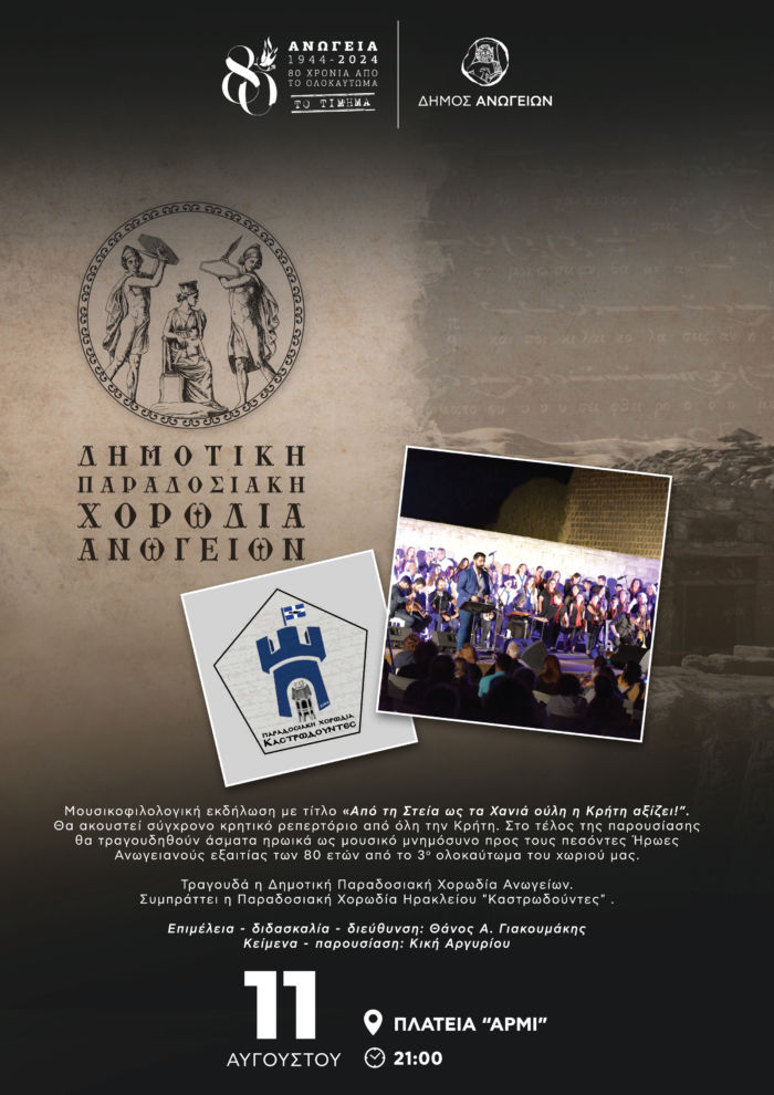 Θα ακουστεί σύγχρονο κρητικό ρεπερτόριο από όλη την Κρήτη. Στο τέλος της παρουσίασης θα τραγουδηθούν άσματα ηρωικά ως μουσικό μνημόσυνο προς τους πεσόντες Ήρωες Ανωγειανούς εξαιτίας των 80 ετών από το 3ο Ολοκαύτωμα του χωριού μας.