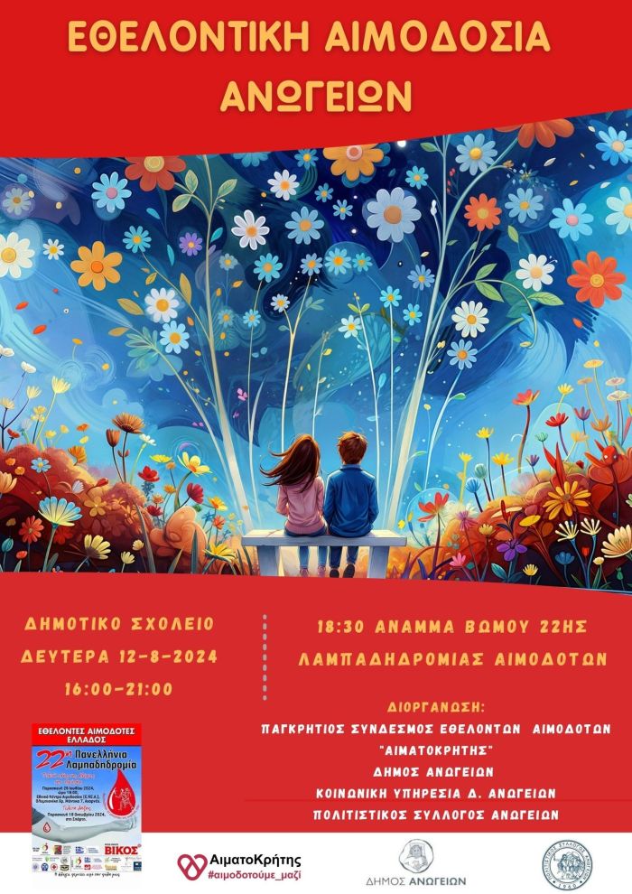 Παράλληλα θα γίνει η εθελοντική αιμοδοσία Ανωγείων από τον “Αιματοκρήτη” στο δημοτικό σχολείο. Θα ξεκινήσει στις 4 μ.μ και θα ολοκληρωθεί στις 9 μ.μ με τους Ανωγειανούς να δίνουν πάντα δυναμικό παρόν και δεκάδες φιάλες αίματος προσφορά στο συνάνθρωπο που έχει ανάγκη.