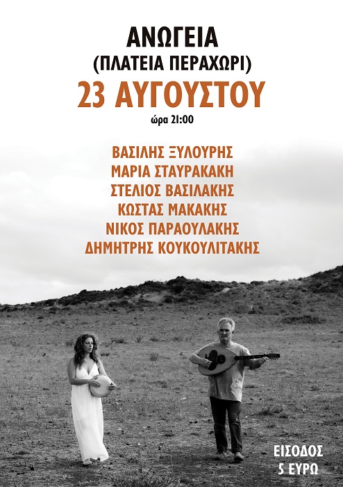 Συναυλία Κρητικής μουσικής με το συγκρότημα του Βασίλη Ξυλούρη και της Μαρίας Σταυρακάκη θα πραγματοποιηθεί στα Ανώγεια (Πλατεία Περαχώρι) την Παρασκευή 23 Αυγούστου, στις 21.00.