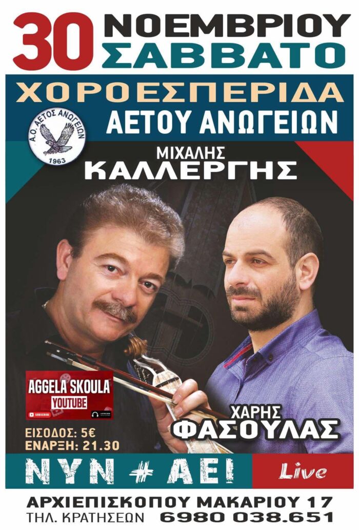 Η χοροεσπερίδα θα γίνει το Σάββατο 30 Νοεμβρίου στις 9.30 μ. Η είσοδος θα είναι 5 ευρώ. “Σας περιμένουμε όλους για να περάσουμε μια αξέχαστη βραδιά” αναφέρει ο Αετός Ανωγείων.