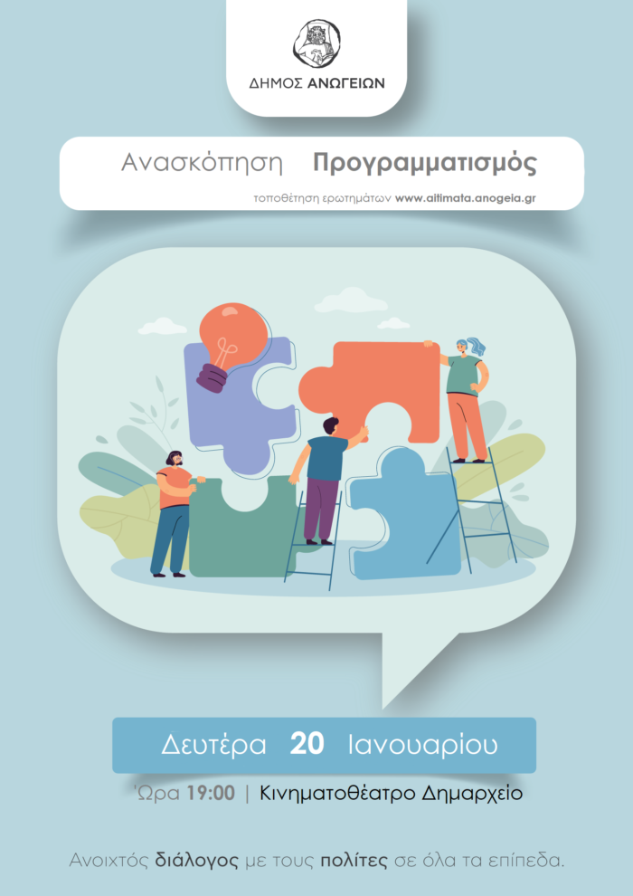 Ο Δήμος Ανωγείων, καλεί όλους τους δημότες, στις 20 Ιανουαρίου ημέρα Δεύτερα και ώρα 19:00 μμ στο Κινηματοθέατρο του Δήμου Ανωγείων στην συνεδρίαση λογοδοσίας.