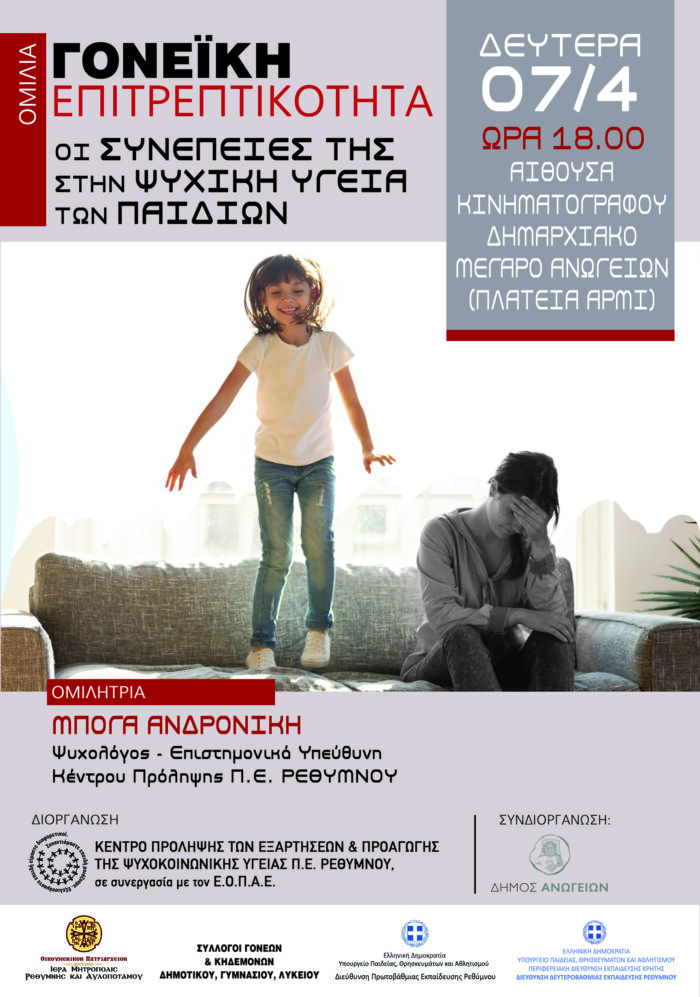 Το Κέντρο Πρόληψης των Εξαρτήσεων και Προαγωγής της Ψυχοκοινωνικής Υγείας Π.Ε Ρεθύμνης, στα πλαίσια της συνεργασίας του με τους Δήμους της Π.Ε. Ρεθύμνου, την Ιερά Μητρόπολη Ρεθύμνης και Αυλοποτάμου και την Ιερά Μητρόπολη Λάμπης και Σφακίων, τις Διευθύνσεις Πρωτοβάθμιας και Δευτεροβάθμιας Διεύθυνσης Ρεθύμνου και τους κατά τόπους φορείς και Πολιτιστικούς Συλλόγους υλοποιεί σειρά ομιλιών για γονείς με θέμα: «Γονεϊκή Επιτρεπτικότητα: οι συνέπειες στην ψυχική ζωή των παιδιών», σε όλη την Περιφερειακή ενότητα Ρεθύμνου.