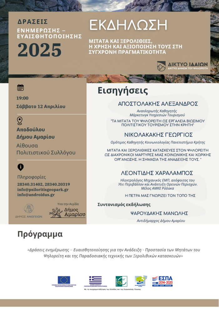 Η εκδήλωση έχει τίτλο: Μιτάτα και Ξερολιθιές, η χρήση και αξιοποίησης τους στη σύγχρονη πραγματικότητα.
