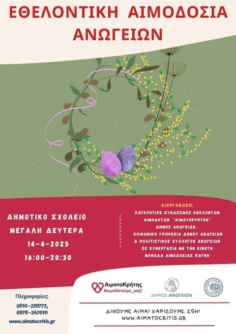 Εθελοντική Αιμοδοσία θα πραγματοποιηθεί την Μ. Δευτέρα 14 Απριλίου στο Δημοτικό Σχολείο Ανωγείων και ώρες 4 μ.μ. έως 8.30 μ.μ.
