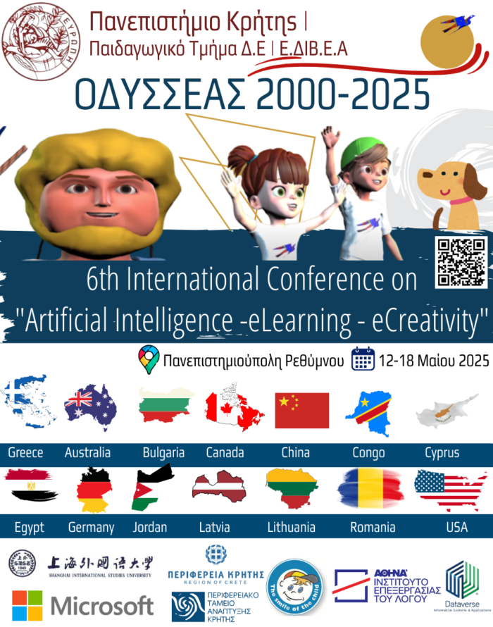 Το 6ο Διεθνές Συνέδριο με θέμα: «Artificial Intelligence -eLearning – eCreativity» διοργανώνει το Εργαστήριο Προηγμένων Μαθησιακών Τεχνολογιών στη Δια Βίου και Εξ Αποστάσεως Εκπαίδευσης (Ε.ΔΙ.Β.Ε.Α) του Παιδαγωγικού Τμήματος του Πανεπιστημίου Κρήτης στην Πανεπιστημιούπολη του Γάλλου, με επίσημη έναρξη την Παρασκευή 16 Μαΐου 2025 και ώρα 9:00 στο Αμφιθέατρο Δ7 Πανεπιστημιούπολη Ρεθύμνου.
