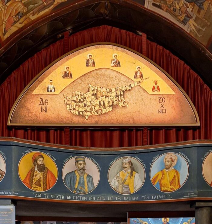 Εδώ στον Άη Γιώργη, πάνω ακριβώς από τους ήρωες του 1821, από τις μνήμες της Τουρκοκρατίας και των Αγώνων για την πολυπόθητη και ευλογημένη Λευτεριά , υψώσαμε μνημείο εικόνισμα, την Κύπρο μας, που αγκαλιάζεται από τους Αγίους του Ρεθύμνου και της Κύπρου, τους Γεώργιο Αγγελή Μανουήλ Νικόλαο Πολύδωρο και Γεώργιο. Και μέσα στα σπλάχνα της Μεγαλονήσου, ξεκουράζονται με ορθάνοικτα όμως τα μάτια της Ελπίδας οι 79 αγνοούμενοι.