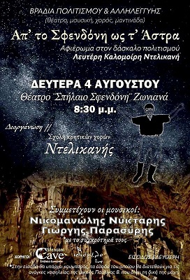 Η Σχολή Κρητικών Χορών «Ντελικανής», την οποία διατηρούν σήμερα τα παιδιά του Λευτέρη Καλομοίρη, διοργανώνει μια ξεχωριστή Βραδιά Πολιτισμού και Αλληλεγγύης, τη Δευτέρα 4 Αυγούστου και ώρα 20:30, στο Θέατρο Σπήλαιο Σφενδόνη, στα Ζωνιανά.