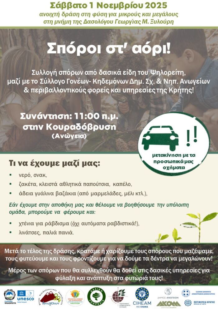 Το Σάββατο, 1 Νοεμβρίου, περιβαλλοντικοί φορείς και υπηρεσίες της Κρήτης μαζί με το Σύλλογο Γονέων και Κηδεμόνων του Δημοτικού Σχολείου και Νηπιαγωγείου Ανωγείων, συνδιοργανώνουν εξόρμηση στο Ανωγειανό αόρι, με σκοπό τη συλλογή σπόρων από δασικά είδη δένδρων της περιοχής μας!