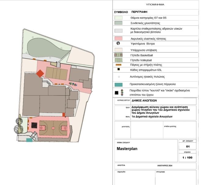 Το έργο αφορά τη ριζική αναδιαμόρφωση των αύλειων χώρων του 1ου Δημοτικού Σχολείου Ανωγείων, συνολικής έκτασης περίπου 3.000 τ.μ., με στόχο τη βελτίωση της ασφάλειας, λειτουργικότητας και αισθητικής του σχολικού περιβάλλοντος.