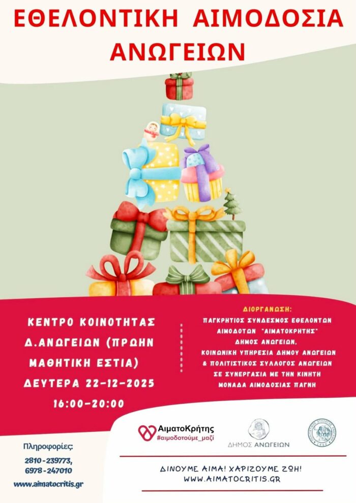 Εθελοντική Αιμοδοσία θα πραγματοποιηθεί την Δευτέρα 22/12/2025 ώρες 16:00-20:00 Στο Κέντρο Κοινότητας Δήμου Ανωγείων (Πρώην Μαθητική Εστία).