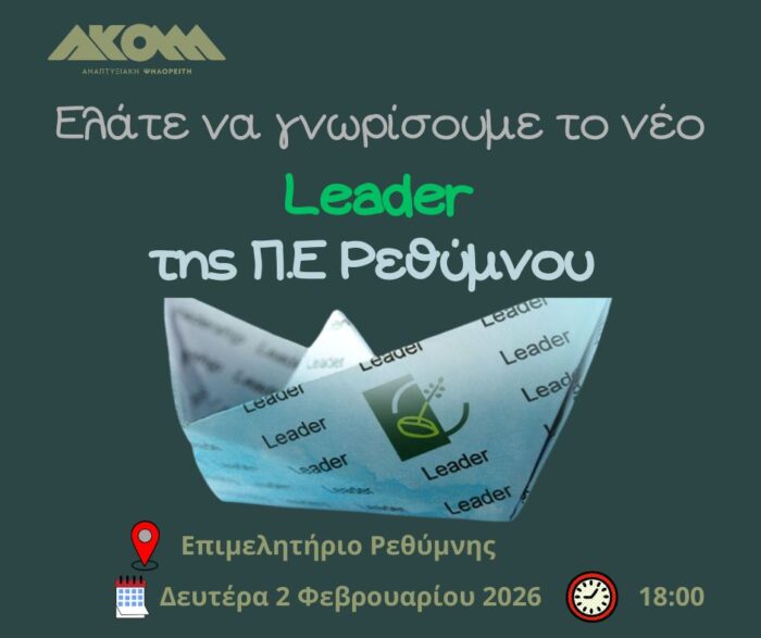 Tη Δευτέρα 2 Φεβρουαρίου 2026, και ώρα 18:00, στην αίθουσα του Επιμελητηρίου Ρεθύμνου θα πραγματοποιηθεί ενημερωτική εκδήλωση σχετικά με το νέο LEADER 2023-2027 το οποίο θα εφαρμοσθεί στην Π.Ε Ρεθύμνου.