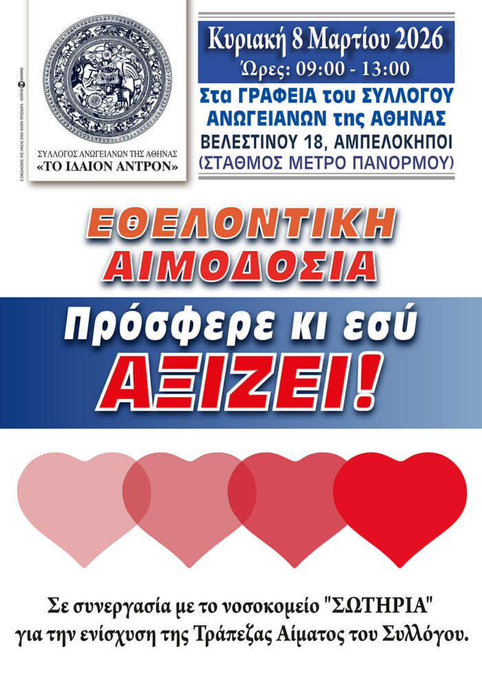 Εθελοντική Αιμοδοσία – Πρόσφερε κι εσύ ΑΞΙΖΕΙ! Ο Σύλλογος Ανωγειάνων της Αθήνας «Το Ιδαίον Άντρον» σε προσκαλεί σε μια πράξη αγάπης και προσφοράς!