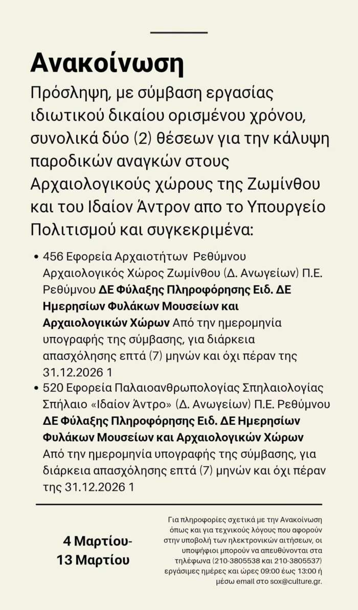 Ανακοινώθηκε η πρόσληψη, με σύμβαση εργασίας ιδιωτικού δικαίου ορισμένου χρόνου, συνολικά δύο (2) θέσεων για την κάλυψη παροδικών αναγκών στους Αρχαιολογικούς χώρους της Ζωμίνθου και του Ιδαίον Άντρον του Υπουργείου Πολιτισμού και συγκεκριμένα