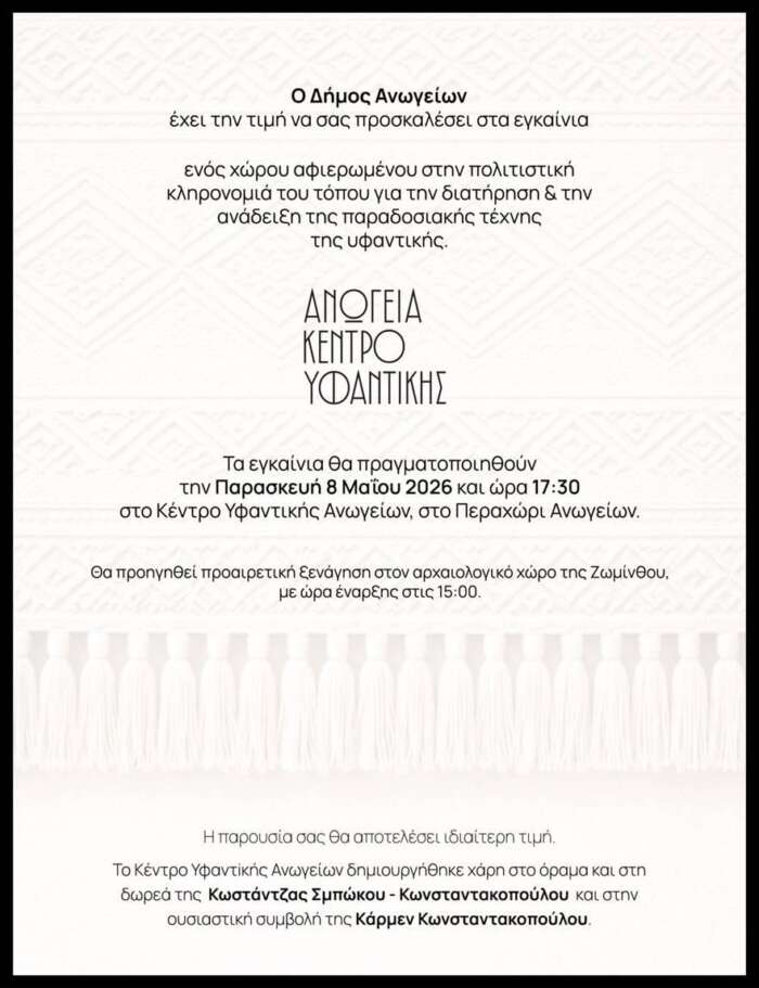 Τα εγκαίνια θα πραγματοποιηθούν την Παρασκευή 8 Μαΐου 2026 και ώρα 17:30, στο Κέντρο Υφαντικής Ανωγείων, στο Περαχώρι Ανωγείων.