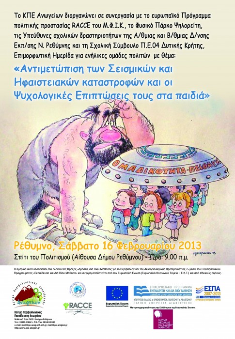 «Αντιμετώπιση των Σεισμικών και Ηφαιστειακών καταστροφών και οι Ψυχολογικές Επιπτώσεις τους στα παιδιά» για ομάδες ενηλίκων πολιτών της τοπικής κοινωνίας της περιοχής του Ν. Ρεθύμνης το Σάββατο 16 Φεβρουαρίου 2013 στο Ρέθυμνο, στο «Σπίτι του Πολιτισμού».