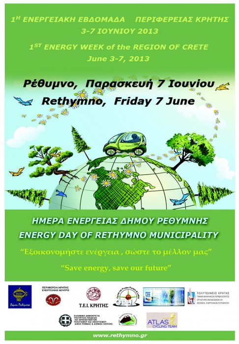 Στο πλαίσιο αυτό, την Παρασκευή 7 Ιουνίου θα διοργανωθεί για πρώτη φορά από το Δήμο Ρεθύμνου, «Ημέρα Ενέργειας» με τη συμμετοχή της Κ.Ε.ΔΗ.Ρ, του Ερευνητικού Κέντρου Φυσικής Πλάσματος και Laser του Τ.Ε.Ι. Κρήτης, του Τ.Ε.Ε-Τμήμα Δυτικής Κρήτης-Νομαρχιακή Επιτροπή Ρεθύμνου, του Εργαστηρίου Ανανεώσιμων και Βιώσιμων Ενεργειακών Συστημάτων του Πολυτεχνείου Κρήτης, του Κέντρου Περιβαλλοντικής Εκπαίδευσης (ΚΠΕ) Ανωγείων, των Διευθύνσεων Πρωτοβάθμιας και Δευτεροβάθμιας Εκπαίδευσης Ρεθύμνου και του Ποδηλατικού Αθλητικού Συλλόγου «Άτλας».